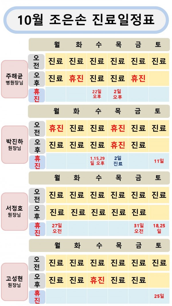 [공지사항] 2025년 10월 조은손병원 진료일정표 작성일 : 2025.09.22 조은손병원 댓글 : 0 조은손병원 10월 진료일정표 입니다.진료보실 때 참조하시기 바랍니다.감사합니다.