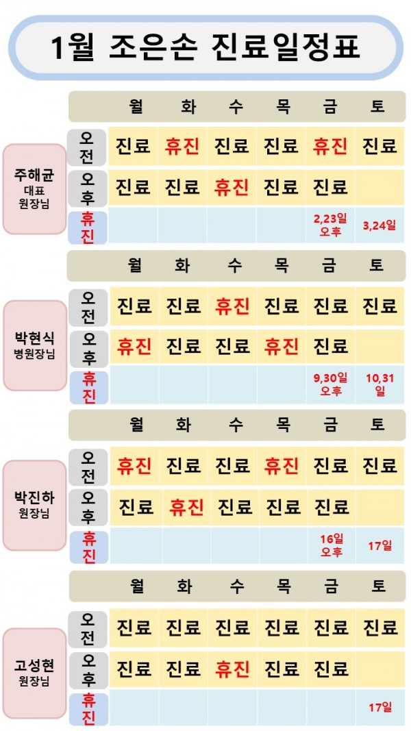 [공지사항] 2026년 1월 조은손병원 진료일정표 작성일 : 2025.12.30 조은손병원 댓글 : 0 조은손병원 1월 진료일정표 입니다.진료보실 때 참조하시기 바랍니다.감사합니다.