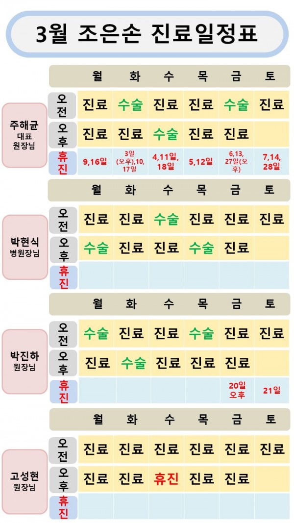 [공지사항] 2026년 3월 조은손병원 진료일정표 작성일 : 2026.02.26 조은손병원 댓글 : 0 조은손병원 3월 진료 일정표 입니다.- 주해균 대표원장님 3/3일 (오후) ~ 3/18일 까지 휴진이오니 참고 부탁 드립니다.진료 보실 때 참조하시기 바랍니다.
